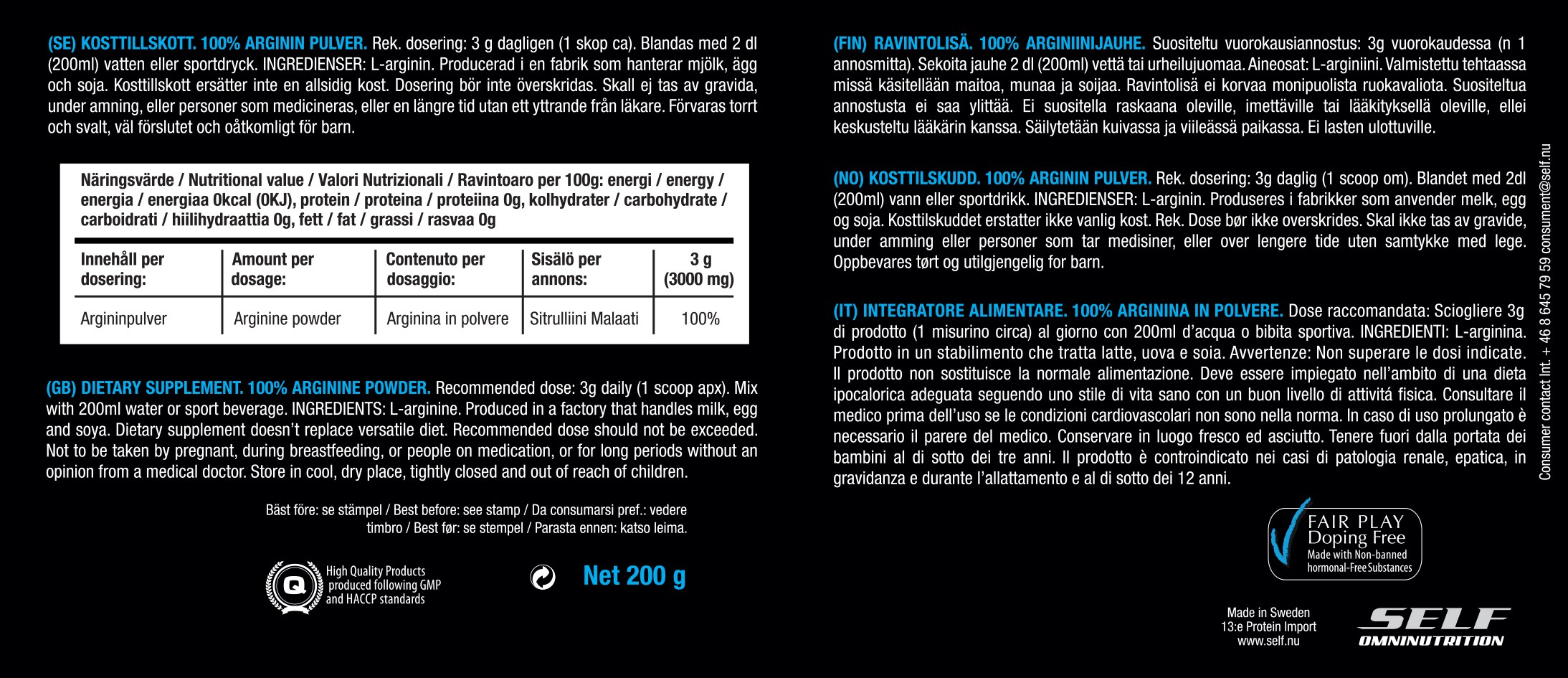 Innehåll/dosering (3g)Dosering: 3 gArgininpulver: 100%
